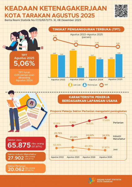Jumlah angkatan kerja pada Agustus 2025 sebanyak 119.903 orang, turun 1.719 orang dibanding Agustus 2024. Tingkat Partisipasi Angkatan Kerja (TPAK) me...