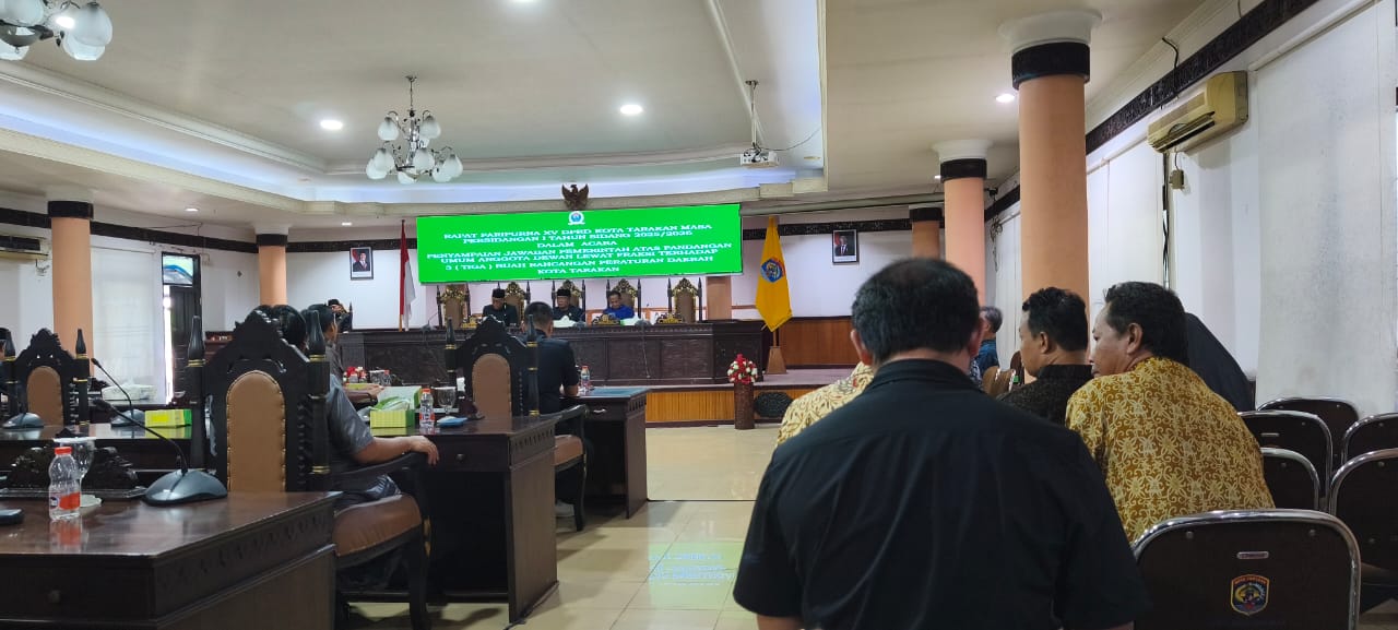 Rapat paripurna XIV DPRD kota Tarakan masa sidang 2025/2026 dalam acara Penyampaian Jawaban Pemerintah Atas Pandangan Umum Anggota Dewan Lewat Fraksi terhadap 3 (tiga) buah Rancangan Perda Kota Tarakan