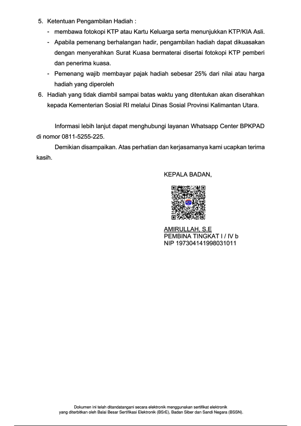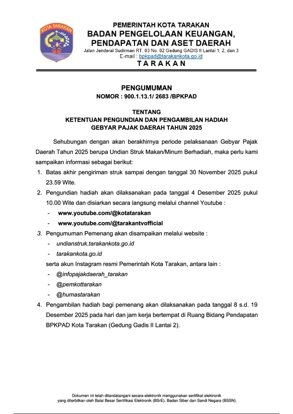 Pengumuman Tentang Ketentuan Pengundian dan Pengambilan Hadiah Gebyar Pajak Daerah Tahun 2025