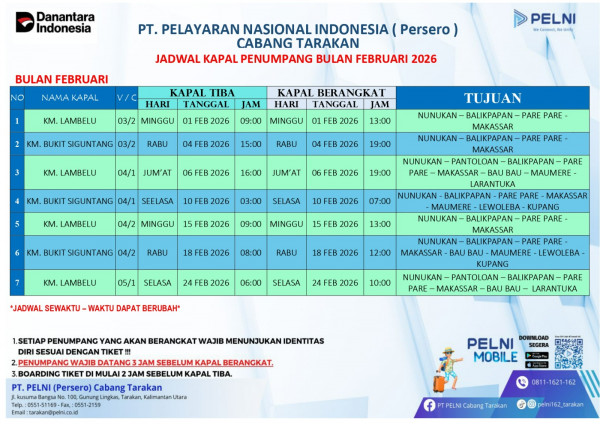 UPDATE : JADWAL KAPAL PENUMPANG YANG MENYINGGAHI PELABUHAN MALUNDUNG TARAKAN BULAN FEBRUARI 2026.NB : BELILAH TIKET JAUH HARI SEBELUM KEBERANGKATAN SE...